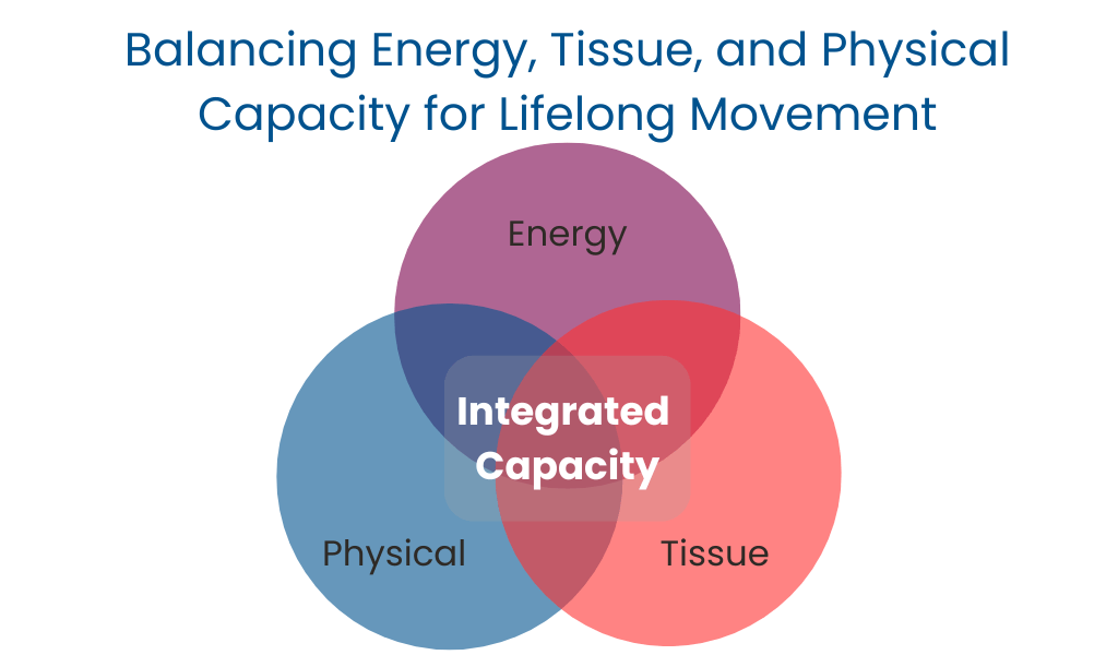These capacities interact constantly. A mismatch — such as training harder than tissue can tolerate, or exercising while energy reserves are depleted — creates flare-ups, fatigue, or early burnout.